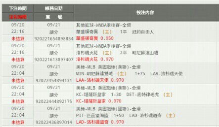 <div>9/21 WNBA國際盤賽事</div><div>AM 01:00</div><div>華盛頓神秘 1平 </div><div>AM 03:00</div><div>洛杉磯火花 2平</div><div><img src="https://pic.pimg.tw/e0913019268/1442792591-4218272897.jpg?v=1442792592" alt=""><br></div><div><br></div>